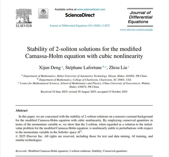 近日,学校民革党员邓习军博士领衔团队在国际知名数学学术期刊Journal of Differential Equations发表论文Stability of 2-soliton solutions for the modified Camassa-Holm equation with cubic nonlinearity。